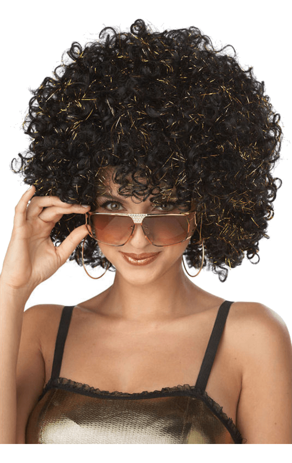 Watch the gold strands glimmer as you moonwalk across the dance floor in this Adult Black and Gold Disco Glitter Wig. Perfect for a 1970s & 1960s party, this ‘fro will help you with all that mingling. It’s quite the conversation starter.