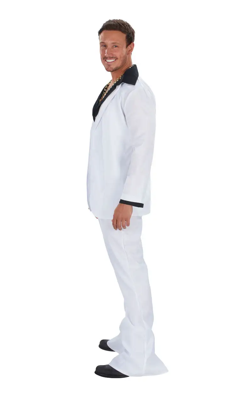 Boogie on down to the dance floor with our Adult White 1970’s Suit Costume. You’ll look the part whilst you are strutting your stuff and busting out your best Saturday Night Fever-esque moves.