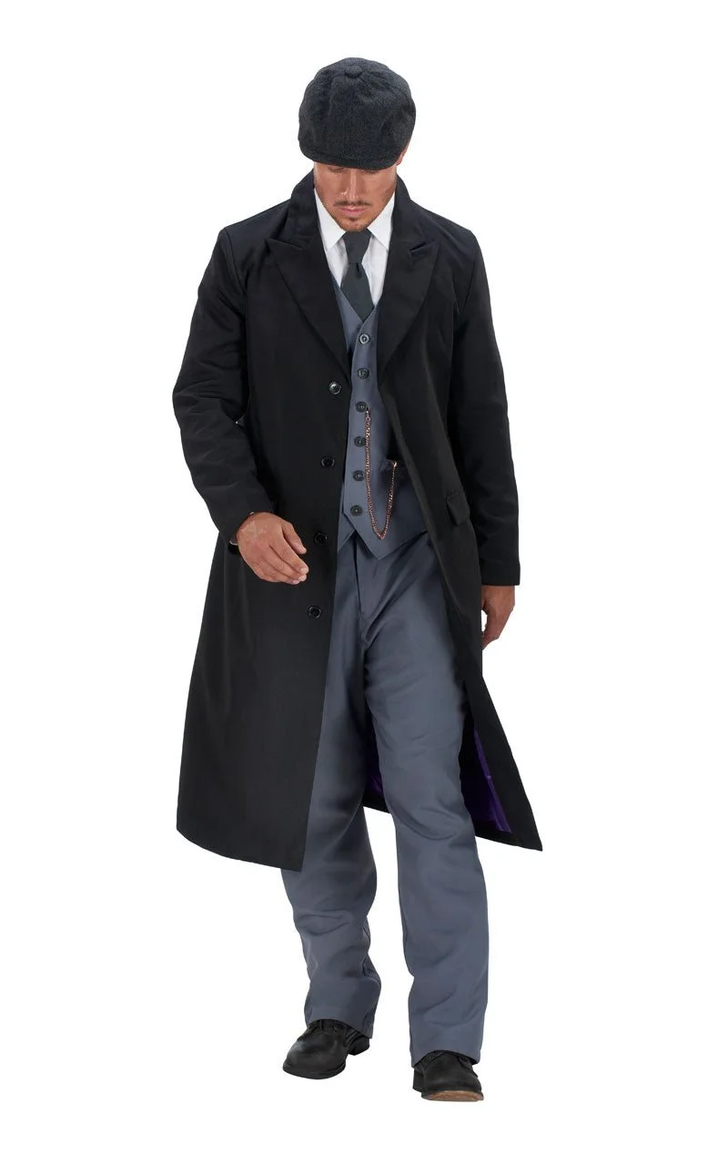 The Mens 1920s British Gangster Costume comes complete with a long, slim black coat, featuring buttons on the front that can be fastened up. The costume also features a smart grey waistcoat with a gold chain hanging from the pocket, a pair of matching trousers and a black skinny tie. To finish off the look, it also comes with a 20’s style flat cap. You have everything you need to become the iconic Brummie gangster! Maybe leave the razor blades at home for this mission…