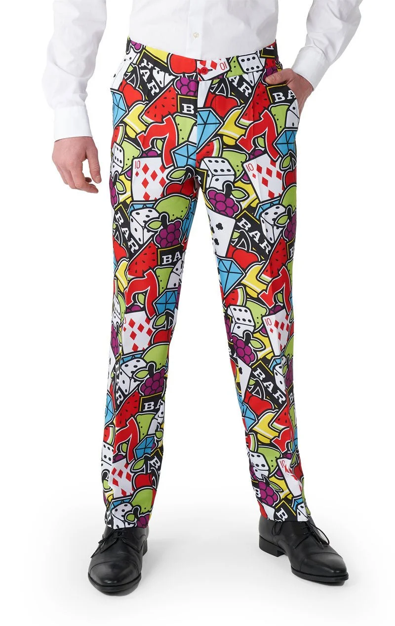 The Mens Casino Icons Opposuit Costume comes complete with a fitted blazer jacket featuring a vibrant casino design, including a pack of cards, dice and other stand-out casino symbols. The outfit also includes a matching skinny tie and a pair of trousers. Just team it up with a plain white shirt, and you’ll be looking the business.
