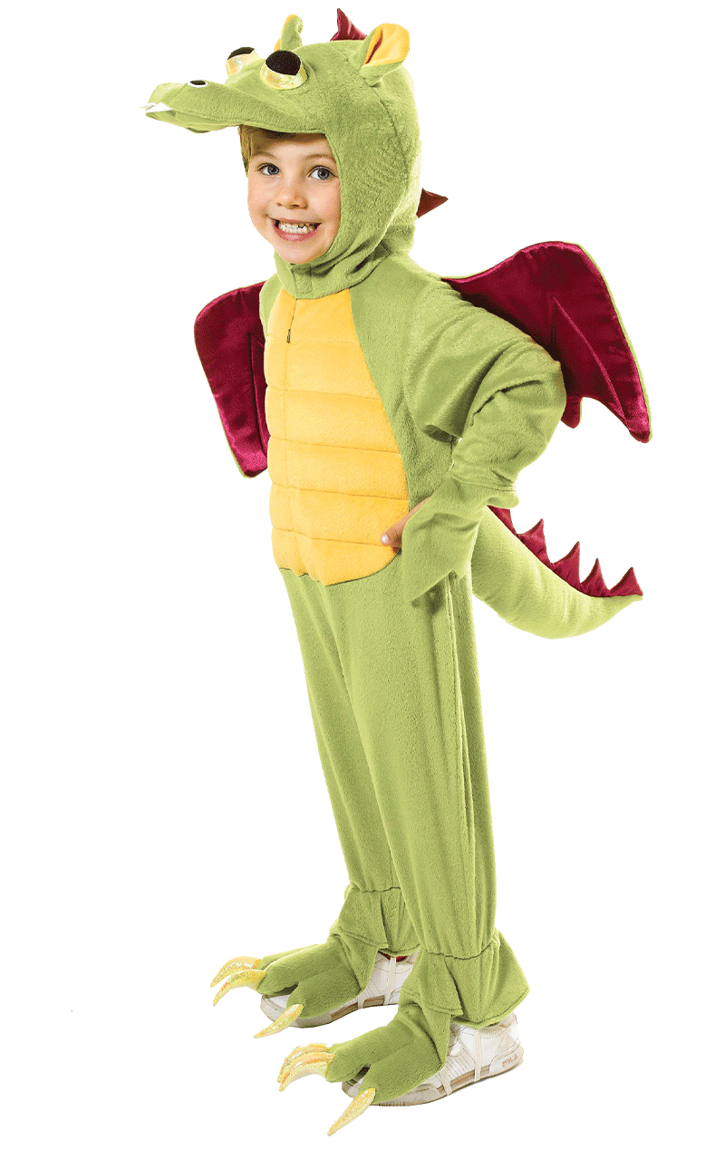 The Kids Dragon Costume includes a green and yellow jumpsuit with a stuffed tail, red wings, a dragon headpiece and attached boot covers. The headpiece features dragon eyes and ears, and the boot covers has attached talons. The headpiece also has an open face to allow your child to give their best dragon roar!