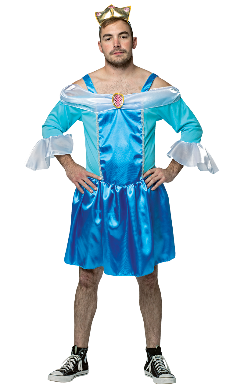 Our Men’s Cinderfella Princess Stag Costume consists of a mini blue dress with off the shoulder sleeves. The dress is a deep blue colour with turquoise detailling throughout. It has frilly sleeves and a gold pendant in the middle to make it extra feminine.