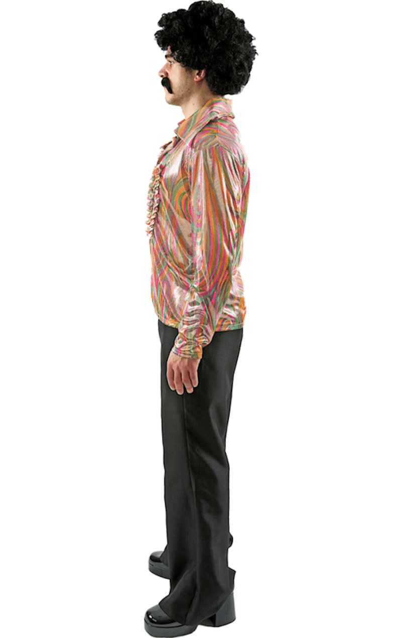 Our Mens Frill Disco Costume combines a psychedelic multi-coloured frill shirt with black flared trousers to make you look like the coolest dude at the disco.