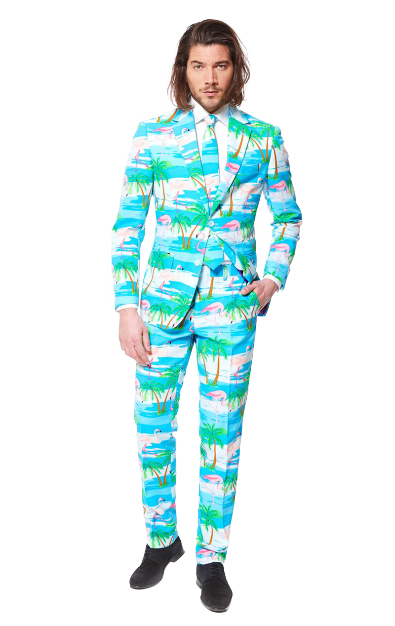 Our Men’s Flaminguy Opposuit comes complete with a smart blazer jacket, featuring flamingos, palm trees and the ocean vibes all over. Also included are a pair of matching trousers to complete the look. To finish off this holiday look is a matching tie that’ll have you looking as dapper as ever. You’ll be oozing in paradise at the party!