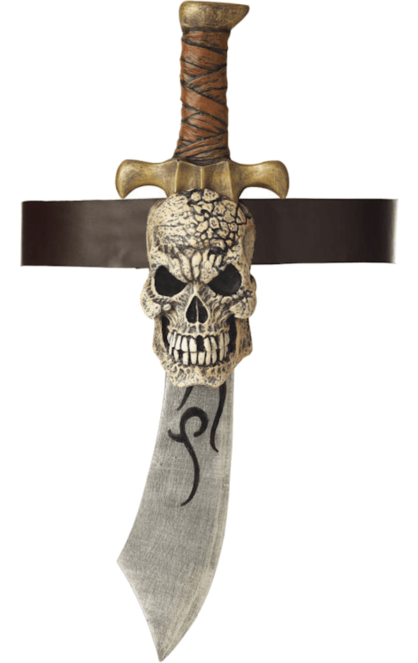 The Pirate Sword with Skull Sheath is a 21” grey pirate sword with a black, brown and gold handle. The accessory also includes a highly detailed skull-shaped sheath, and an attached belt with fabric ties.