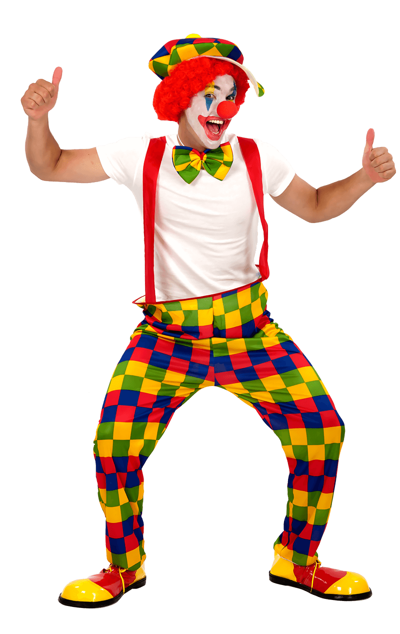 This unisex outfit includes a set of multicoloured chequered hooped trousers with attached braces which are secured to the back of the trousers and fasten in place with two safety pins. The hoop in the trousers is made from a flexible wire which pops back into shape when bent, allowing you to fold away this costume for future use.