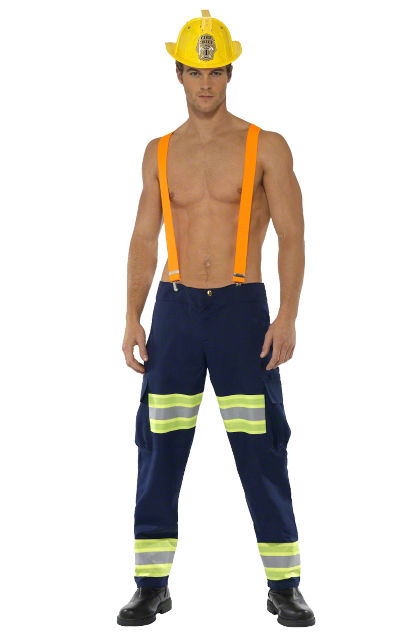 This sexy men’s costume only includes a pair of navy blue trousers with hi-viz detail and a pair of bright orange braces to hold them up, which means you’ll be topless!