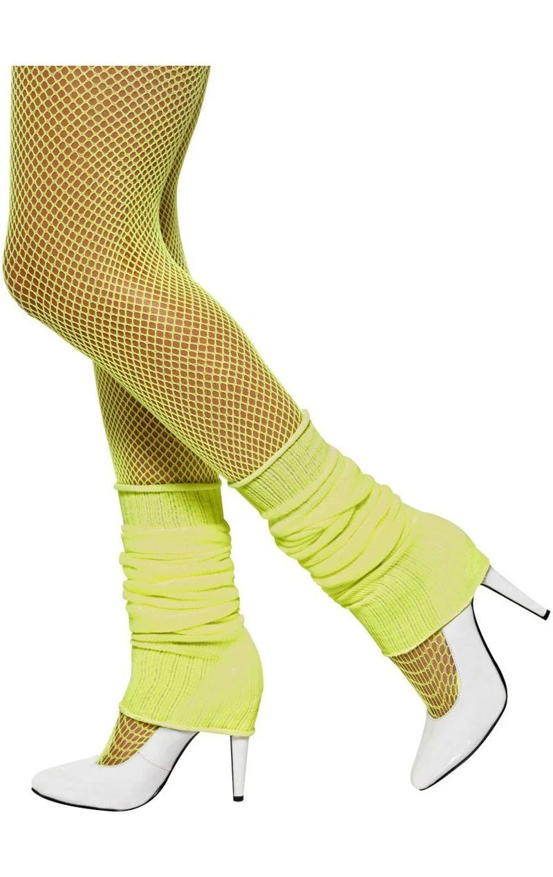 One pair of 80s style neon yellow leg warmers, an ideal accessory for 80s costumes.
