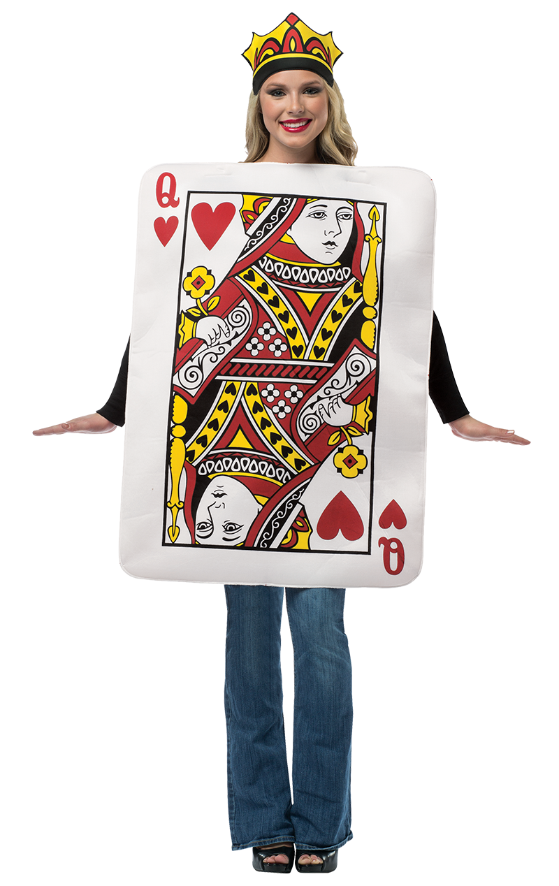 The Womens Queen of Hearts Card Costume consists of a tunic featuring an illustration of the queen of hearts card from a pack of playing cards. The tunic fits on over the head and has a hole for the head and arms to sit comfortably. To ensure you look as royal as possible, the costume also comes with a tiara headpiece to match the outfit.